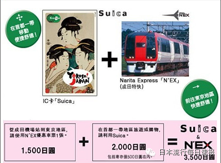 這種優惠折扣票僅向海外游客提供。它含有一張成田特快(N’EX)的單程票,即由成田機場去東京市區的火車票,以及一張價值2,000日元的Suica IC充值卡(1,500日元加上500日元的充值)。僅可在成田機場的JR-EAST旅游服務中心購買。
